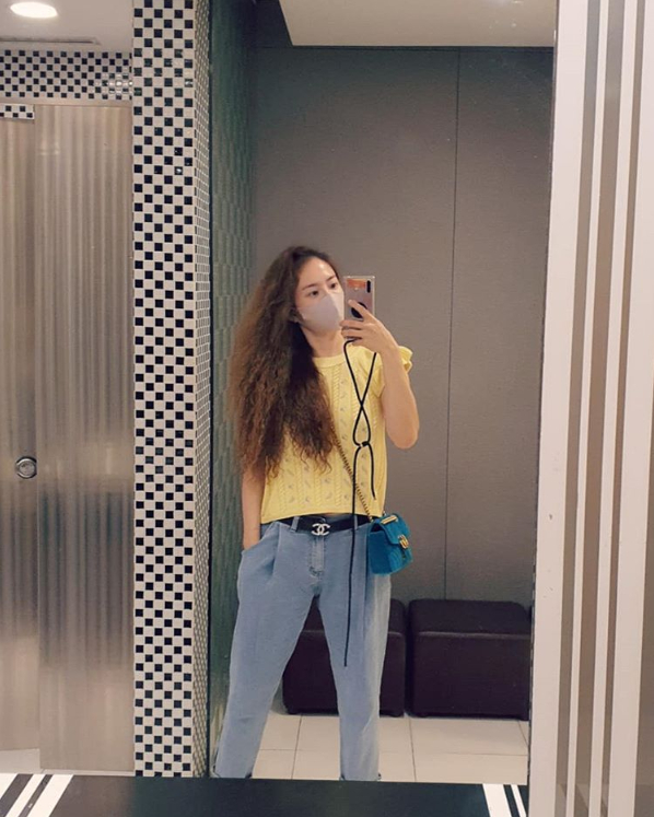 공개된 사진에는 색다른 파마 헤어스타일과 명품 브랜드의 가방, 벨트를 착용한 유하나가 거울 앞에서 촬영한 모습이 담겨져 있네요!