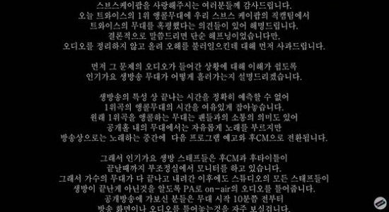 SBS ‘스브스케이팝’ 측은 “먼저 그 문제의 오디오가 들어간 상황에 대해 이해가 쉽도록 인기가요 생방송 무대가 어떻게 흘러가는지 설명드리겠다”며 “생방송의 특성 상 끝나는 시간을 정확히 예측할 수 없어 1위곡의 앵콜무대의 시간을 여유있게 잡아놓습니다. 원래 1위곡을 앵콜하는 무대는 팬들과의 소통의 의미도 있어 공개홀 내의 무대에서는 자유롭게 노래를 부르지만 방송상으로는 노래하는 중간에 다음 프로그램 예고와 후CM으로 전환된다. 그래서 인기가요 생방 스태프들은 후CM과 후타이틀이 끝날 때까지 부조정실에서 모니터를 하고 있다”고 설명을 했네요!