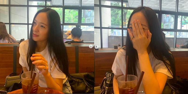 크리스탈의 근황 사진을 보면 카페에서 커피를 마시고 흰 티셔츠에 청바지를 입고 모습을 볼 수 있네요!