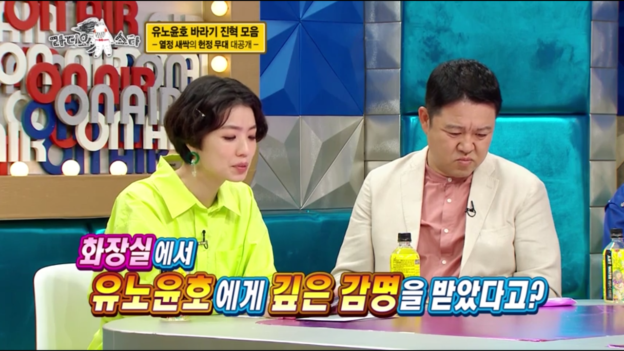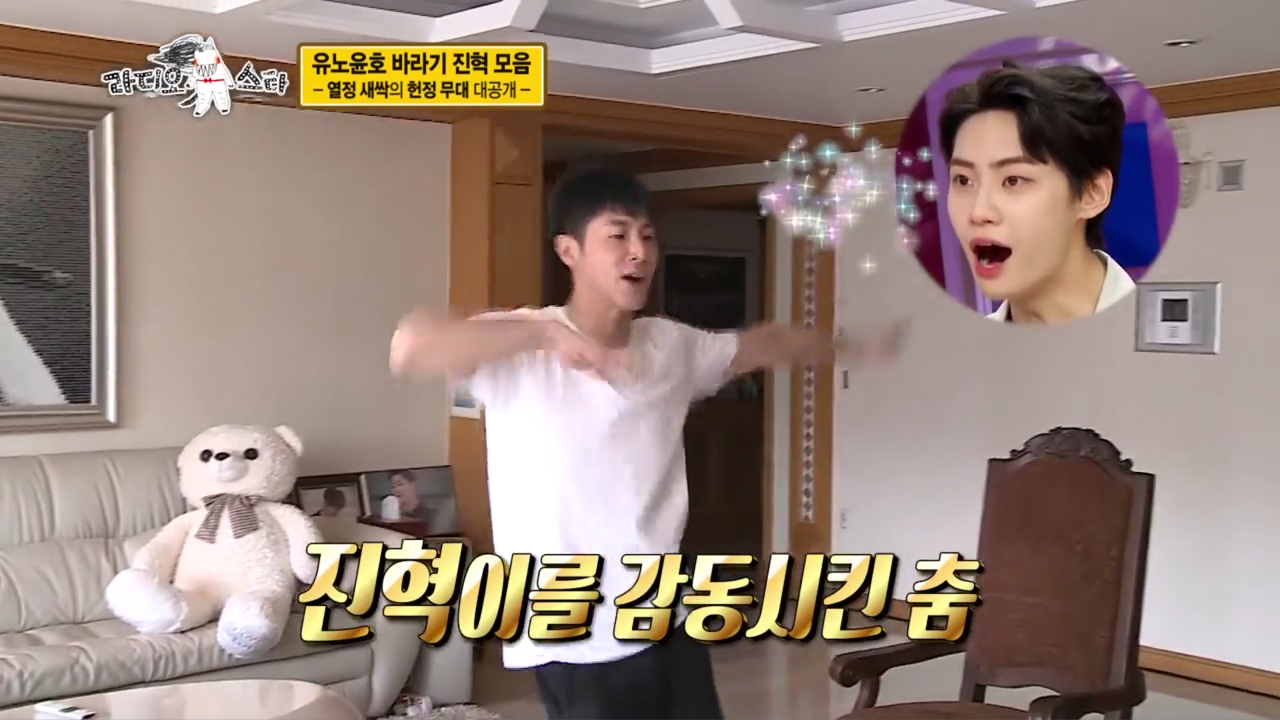 화장실에서 소변을 보는데 롤모델인 유노윤호를 만났다고 합니다. 평소 열정적으로 알려져 있는 유노윤호가 화장실에서 안녕이라고 말해서 그것에 감명 받았다고 합니다.