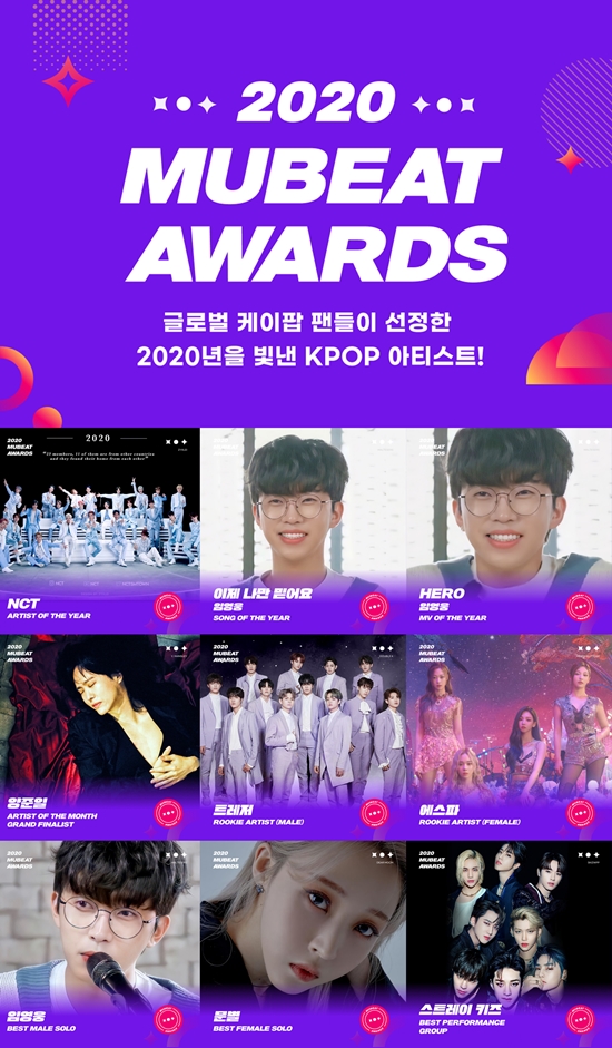 전 세계 케이팝 팬덤 102만명이 참여 9646만표를 얻은 2020 뮤빗 어워즈는 총 9개 부분으로 진행되었고, 올해의 아티스트는 NCT, 올해의 노래는 임영웅의 ‘이제 나만 믿어요’, 올해의 MV는 임영웅의 ‘HERO’, 이달의 아티스트 왕중왕전은 ‘양준일’, 남자 신인아티스트에 트레저, 여자 신인아티스트에 에스파, 베스트 남자 솔로에 임영웅, 베스트 여자 솔로에 문별, 베스트 퍼포먼스 그룹에 스트레이키즈 등의 수상이 확정되었습니다.