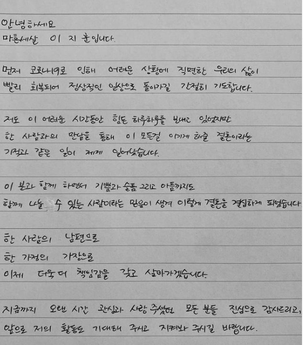 이지훈은 2021년 4월 30일 자신의 팬 카페에 장문의 손편지를 올리며 결혼발표를 했습니다.