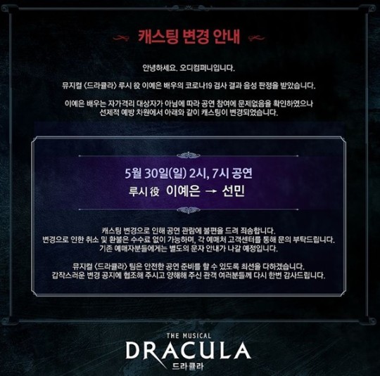 "이예은 배우는 자가격리 대상자가 아님에 따라 공연 참여에 문제없음을 확인하였으나 선제적 예방 차원에서 아래와 같이 캐스팅이 변경됐다. 캐스팅 변경으로 인해 공연 관람에 불편을 드려 죄송하다. 뮤지컬 '드라큘라' 팀은 안전한 공연 준비를 할 수 있도록 최선을 다하겠다"고