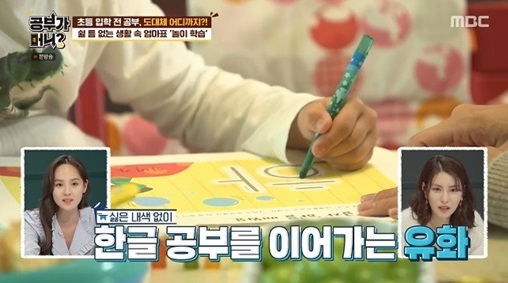김정화는 유치원을 다니고 있는 아들 유화가 아직 한글을 배우지 않고 있다고 밝혔고 남편 유은성의 교육 철학에 따라 엄마와의 대화를 통한 아이표 놀이학습으로 교육하는 모습이 방송을 탔어요!!