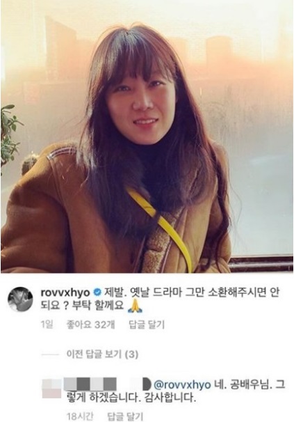 공효진이 직접 해당 계정에 “제발. 옛날 드라마 그만 소환해주시면 안돼요? 부탁할게요”라는 댓글을 적은 것이죠. 공효진의 댓글을 확인한 A씨는 “공 배우님. 그렇게 하겠습니다. 감사합니다”라고 댓글에 답했습니다.