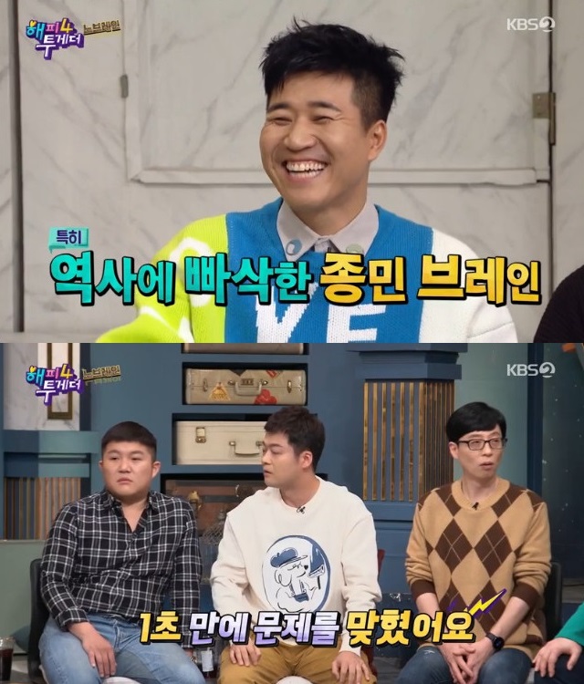 '1박 2일'에서 꾸준히 바보 캐릭터를 맡아왔던 김종민을 둘러싼 천재설이 화두가 되기도 했었죠. 정준하가 "너만 유일하게 바보다. 우리는 바보 연기를 하는 사람들"이라고 했지만, 전현무는 "'문제적 남자'에서 문제 푸는 모습을 촬영한 적이 있는데 1초만에 풀더라. 수능 수준의 역사 문제도 바로 맞혔다. 어떤 게 김종민의 모습이냐"며 천재설을 제기했죠.