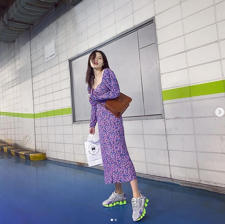 공개된 사진 속 현아는 플라워 패턴의 롱 원피스에 운동화를 신고 입춘이 지나서 현재 봄인데...
