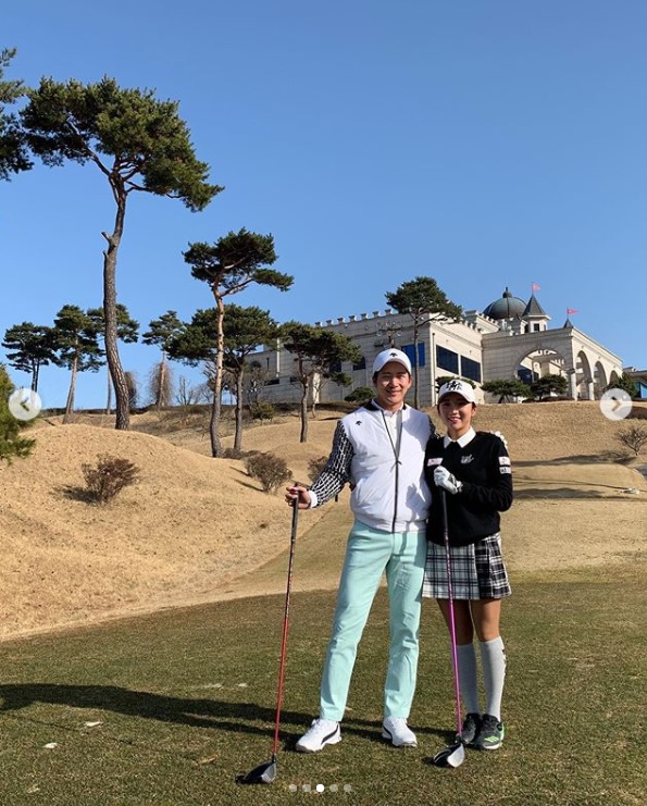사진 속에는 골프장에서 라운딩을 하던 중 포즈를 취하고 있는 이완-이보미 부부의 모습이 담겨있는데, 특히 이보미의 어깨를 다정히 감싸안은 이완의 데이트 모습이네요!